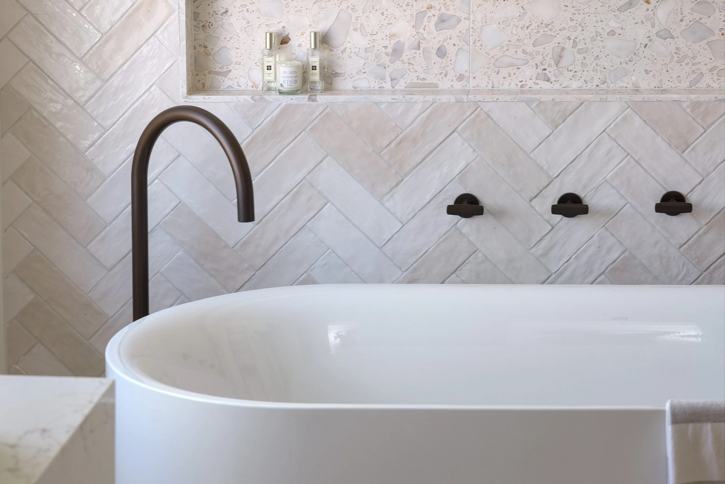Kate’s design brief was clear: she wanted a restful and elevated space that leaned classical rather than trendy - a bathroom that would feel elegant today and remain timeless for years to come. A terrazzo floor, inspired by a hotel stay in France, formed the basis of the scheme. From there, she layered in light, neutral finishes and subtle contrast with beautifully crafted bronze fittings. “I was really drawn to bronze from the start,” says Kate. “It feels luxurious but understated. The taps have a lovely weight to them and bring warmth to the whole room.” Jo recommended a vanity top that picked up on the warm tones of the brassware, bringing the whole design together with effortless harmony.